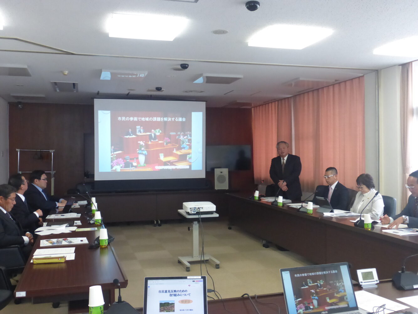 可児市の議会運営サイクルや予算決算審査サイクルについて議長が説明した後、 質疑応答、意見交換を行いました。